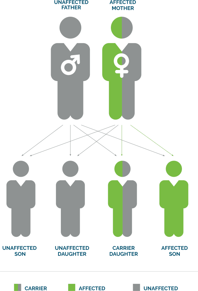 The X and Y chromosomes (often called the sex chromosomes) determine whether a baby is male or female. Males have one X and one Y, while females have two X chromosomes. Some disorders are caused by variants or alterations of the X chromosome. Generally, if a woman has a pathogenic variant on one of the genes located on an X chromosome, she is considered a carrier — and has a 50% chance of passing that variant onto her children. If she passes on the variant on to a male child, that child can be affected with the condition. Affected males will not pass the variant onto their sons, but daughters of affected males will be carriers of the variant. Female carriers rarely develop symptoms of the condition but their daughters have a 50% chance of being carriers.